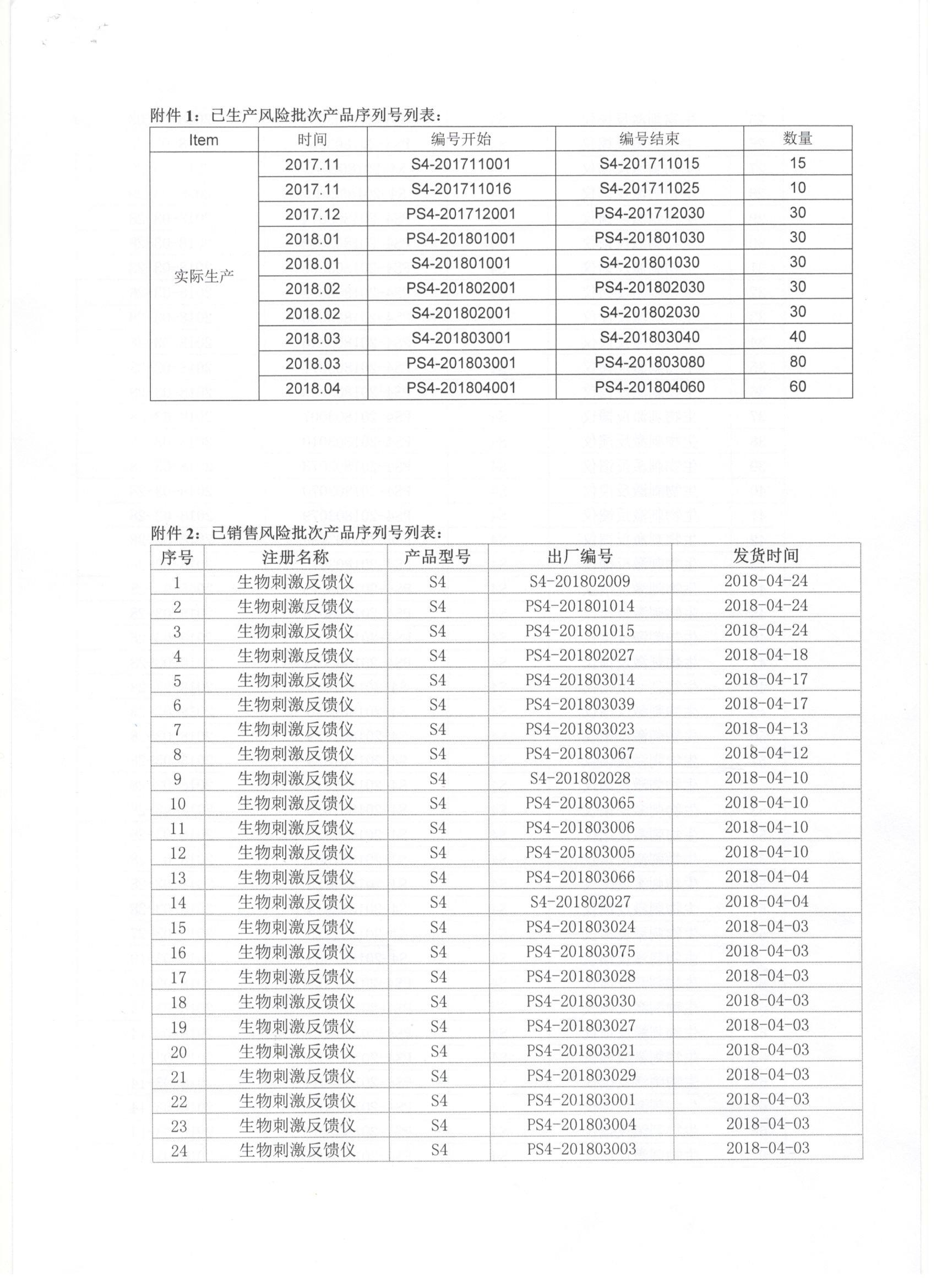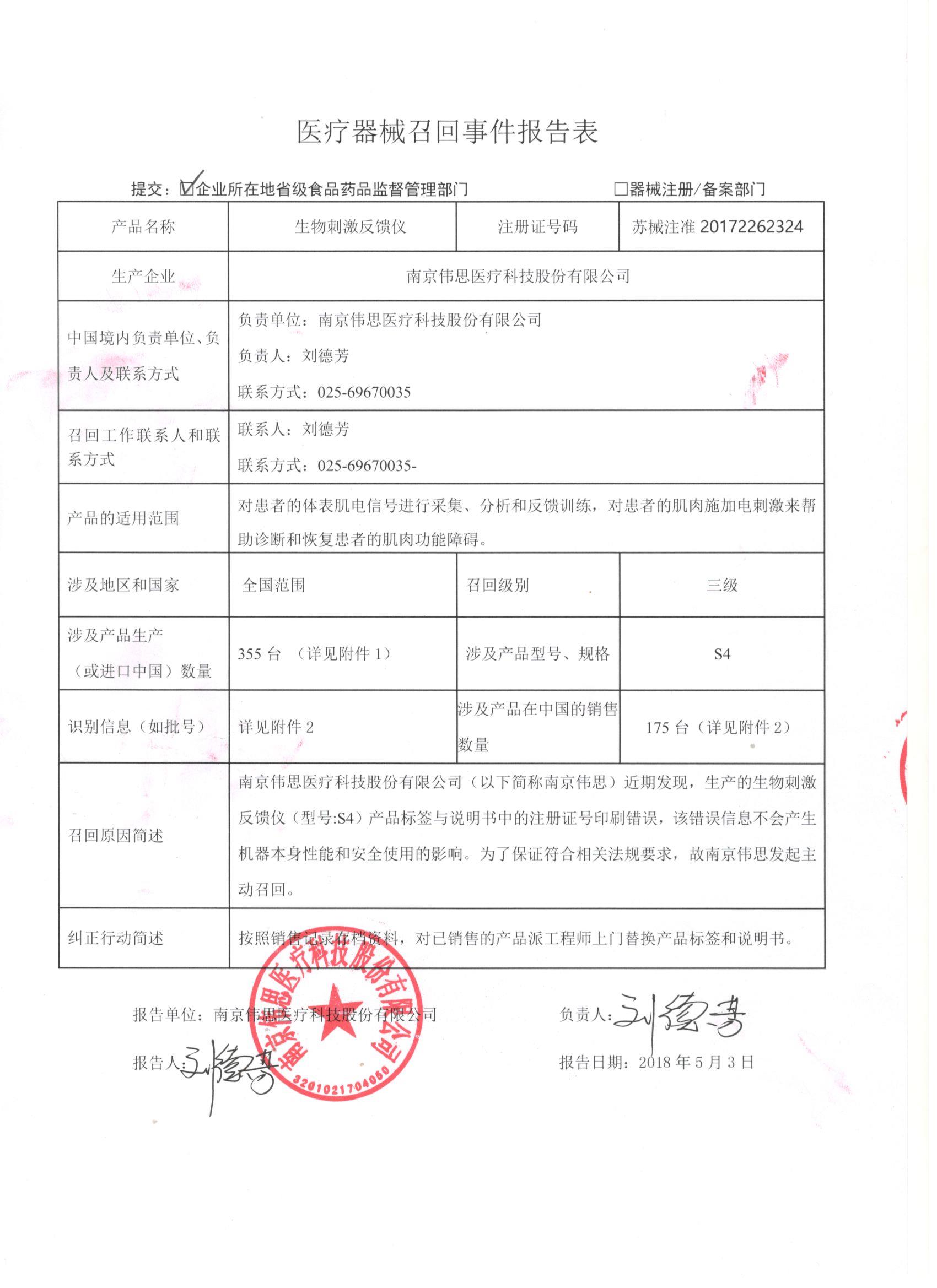 南京伟思医疗科技股份有限公司报告,由于产品标签与说明书印刷错误的原因, 南京伟思医疗科技股份有限公司对其生产的生物刺激反馈仪(注册证编号:苏械注准20172262324)。召回级别为三级。涉及产品的型号、规格及批次等详细信息见《直播平台 召回事件报告表》。