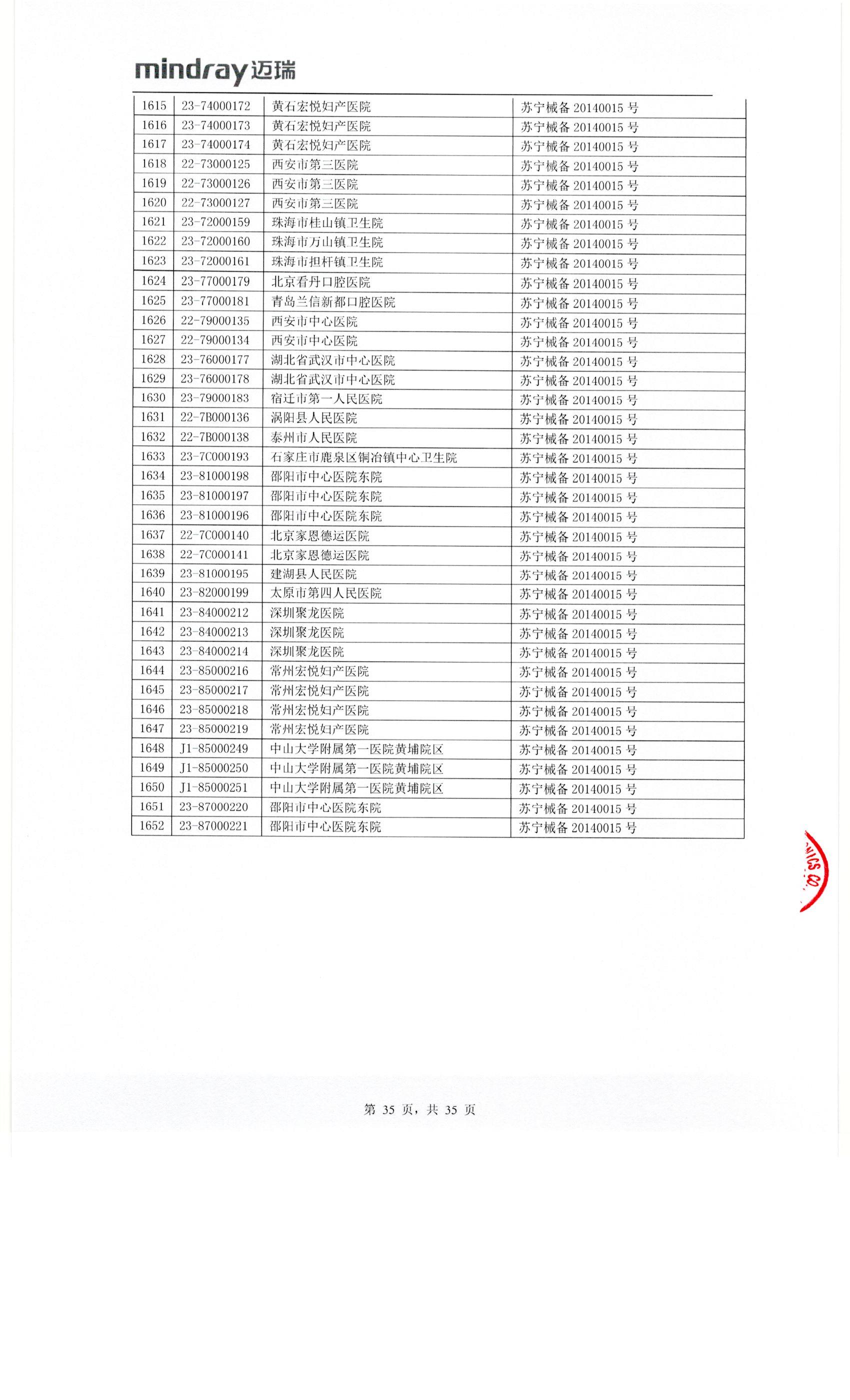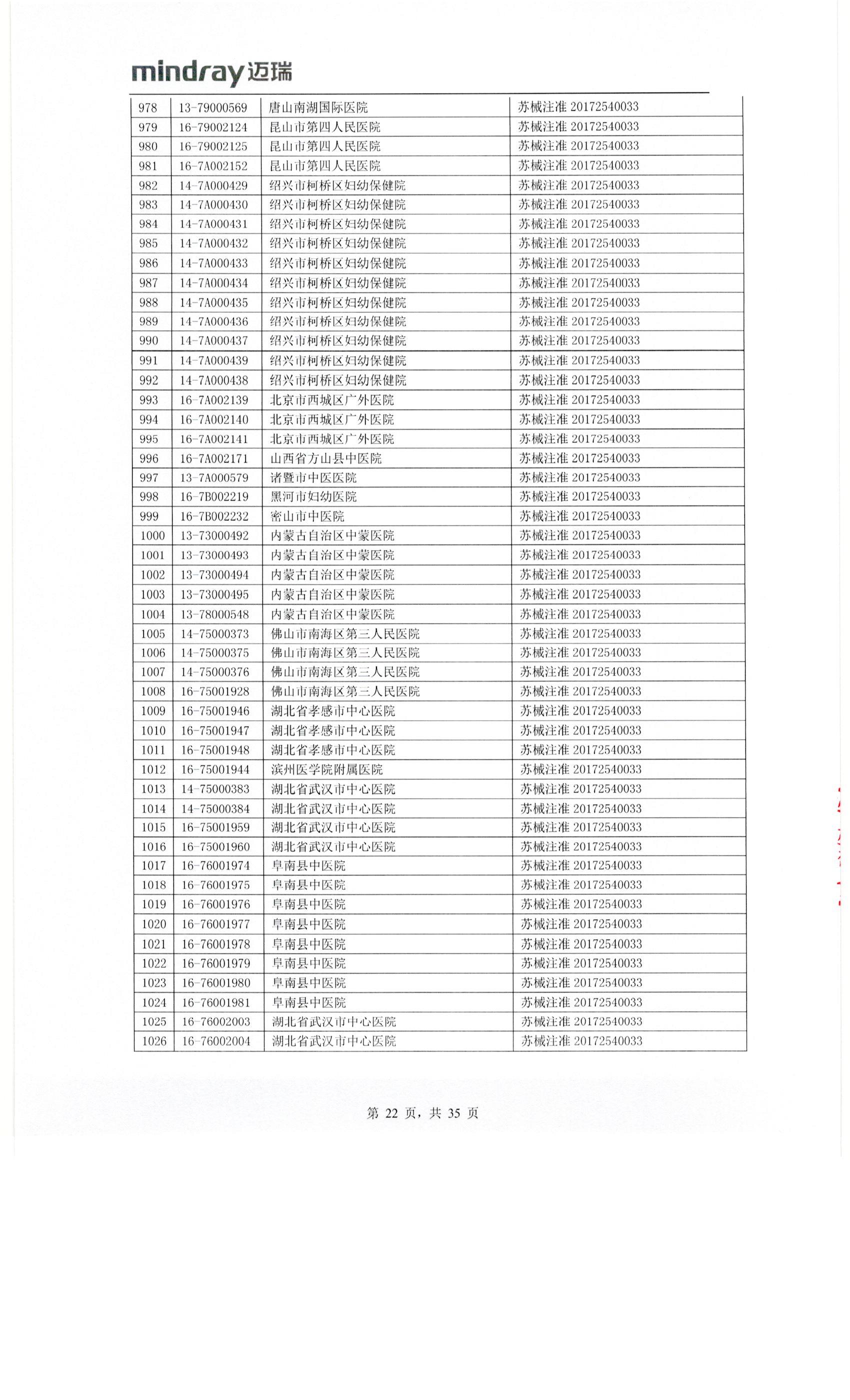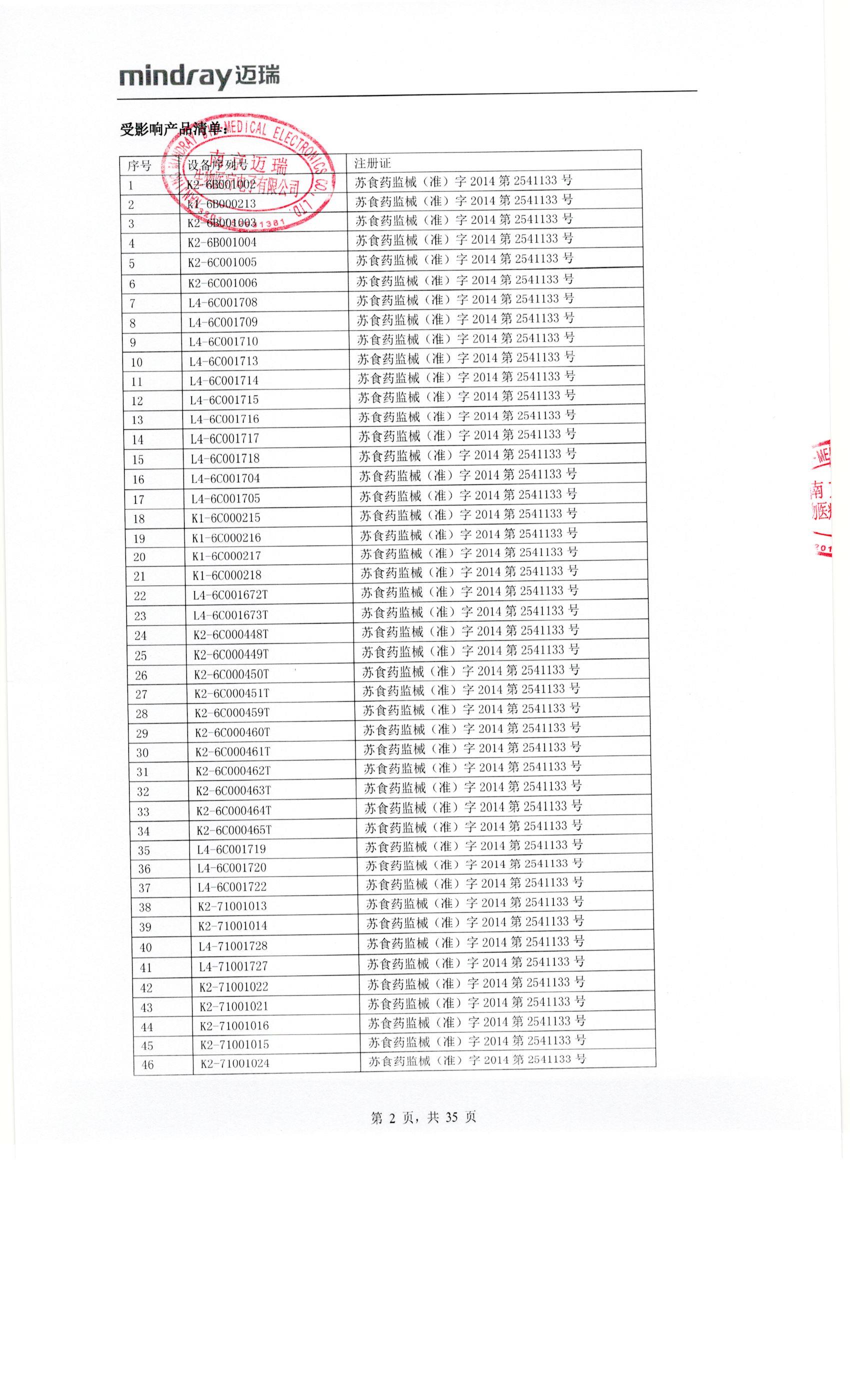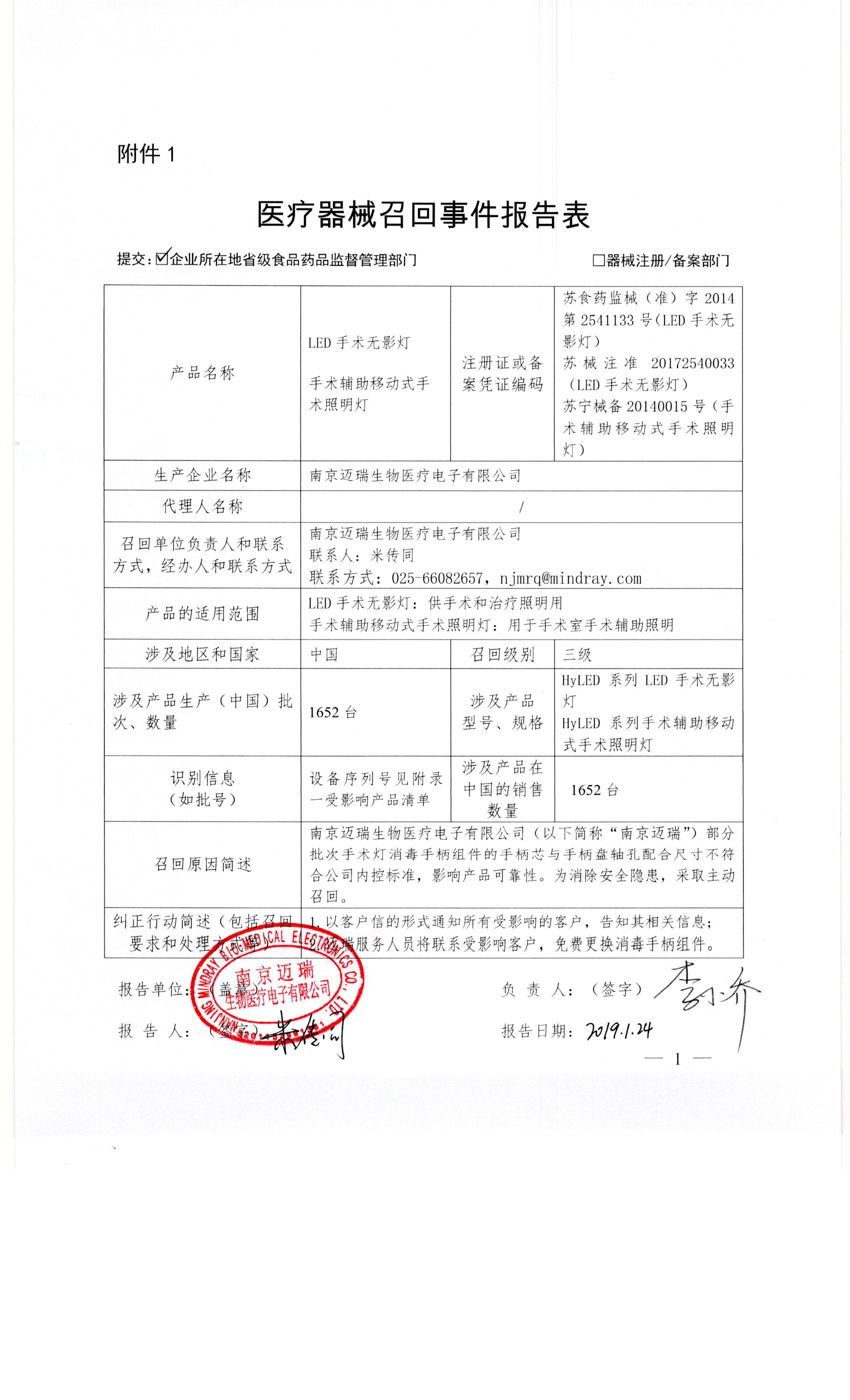 南京迈瑞生物医疗电子有限公司对LED手术无影灯、手术辅助移动式手术照明灯主动召回